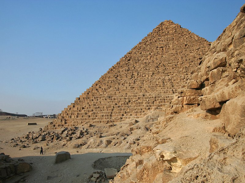All three Giza pyramids can be seen, the furthest was built for king Chufu, the middle is his son's Khafre (Chephren) and the closest is Menkaure's (Mycerinus), the son of Khafre, along with three queens' pyramids, the scale of which could be better imagined by a man standing on the ridge of the righmost / Visos trys Gizos piramides, tolimiausia Cheopso, vidurine Chefreno, Cheopso sunaus, o artimiausioji Mikierino, kuris buvo Chefreno sunus; trys mazesnes Mikerino karalieniu piramides taip pat isliko, o visu statiniu mastelis geriau gali buti ivertintas ziurint i zmogu stovinti and desines karalienes piramides