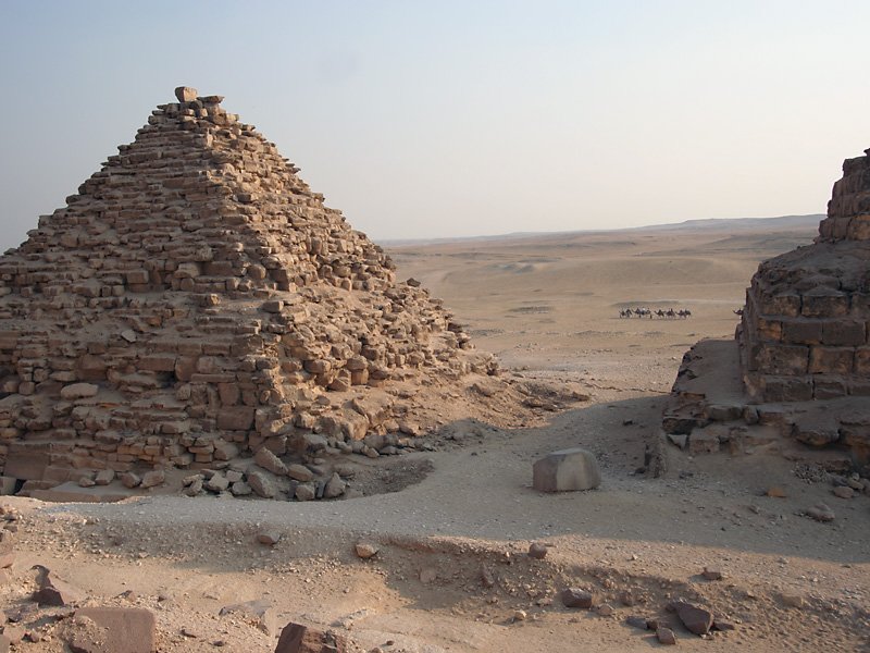 Almost on top of one of the Mycerinus queen's pyramids (overlooking the pharao's pyramid) - it used to be quite popular to climb the Giza pyramids, however this was stopped in 1986, primarily for conservation reasons, but also because some people were falling down to death every year / Uzlipus ant vienos is Mikerino karalieniu piramidziu, priekyje Mikerino piramide; lipimas i didziasias piramides buvo uzdraustas 1986m. norint apsaugoti siuos paminklus ir laipiotojus, keli is kuriu uzsimusdavo kiekvienais metais krisdami nuo piramidziu