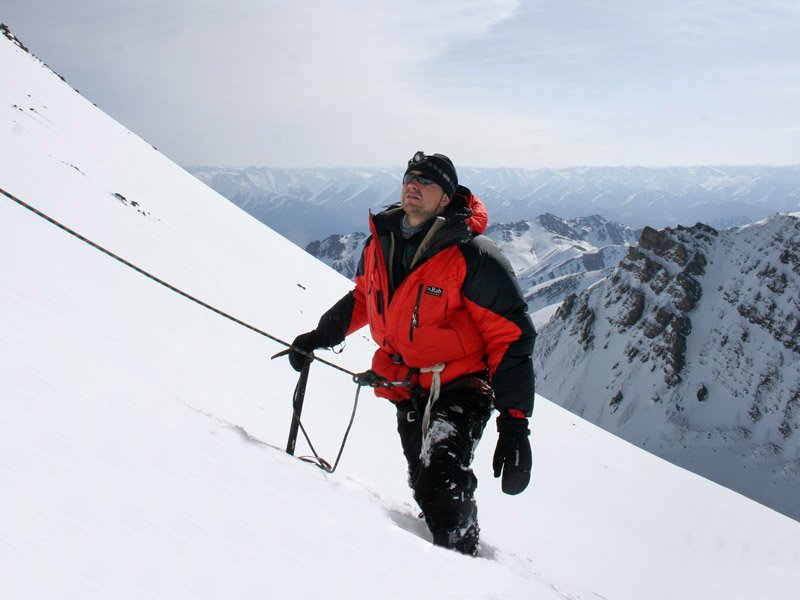 Lipame i Stok Kangri, isejome apie 04:15, gal kiek paveluotai, tolumoje matyti "kabantis" ledynas / Ascending Stok Kangri, left the camp at 04:15 or so, maybe slightly later that necessary, one can see a hanging glacier