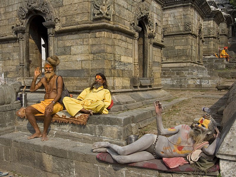 Pashupatinath - one of the most revered Hindu temples in the world (on the left), where entry to non-hindus is prohibited; in the left bottom corner one can see cremation of a human body / Pashupatinah hindu sventykla, viena is svarbiausiu pasaulyje (keireje), kur ileidziami tik hinduistai; kairiajame apatiniame kampe matyti zmogaus palaiku kremacija.